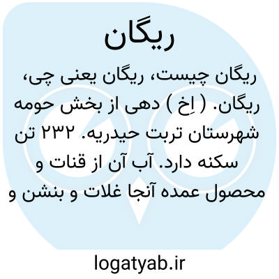 ریگان. ( اِخ ) نام یکی از دهستانهای شش گانه بخش فهرج شهرستان بم، واقع در جنوب خاوری فهرج. حدود شمال: دهستان برج اکرم. خاور: شهرستان زاهدان. جنوب: شهرستان جیرفت. باختر: دهستان گنیگی. منطقه ای است جلگه و دارای آب و هوای گرمسیر مالاریایی. آب زراعتی و مشروبی از قنوات و محصول عمده آنجا غلات، پنبه، حنا، لبنیات، خرما و انواع مرکبات وصنایع دستی زنان قالیچه و گلیم و کرباس بافی است. دارای 52 آبادی و در حدود هفت هزار تن سکنه است. مرکزآن رحمت آباد است. ( از فرهنگ جغرافیایی ایران ج 8 ).