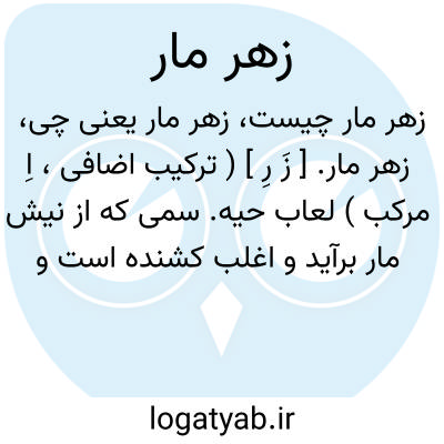 زهر مار. [ زَ رِ ] ( ترکیب اضافی، اِ مرکب ) لعاب حیه. سمی که از نیش مار برآید و اغلب کشنده است و امروزه از انواع این زهرها در داروسازی استفاده می نمایند و قدما آنرا معادل سمی مهلک می گرفته اند: