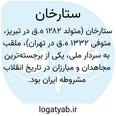 ستارخان (متولد ۱۲۸۲ ه.ق در تبریز، متوفی ۱۳۳۲ ه.ق در تهران)، ملقب به سردار ملی، یکی از برجستهترین مجاهدان و مبارزان در تاریخ انقلاب مشروطه ایران بود. او که اصالتاً از اهالی ارسباران و فرزند حاج حسن قراچهداغی بود، نقش محوری و بیبدیلی در مقاومتهای اولیه ایفا کرد. در دوران استبداد صغیر، ستارخان نخستین کسی بود که در تبریز در برابر نیروهای دولتی ایستادگی کرده و مردم شهر را علیه استبداد تحریک و سازماندهی نمود. پیش از دوران مشروطیت، او در شغل فراشباشی فعالیت داشت و از شخصیتهای بانفوذ و مورد احترام در میان عیاران و لوطیان محله امیرخیز تبریز محسوب میشد و از مریدان میرزا علی آقای ثقهالاسلام، پیشوای وقت فرقهی شیخیه آذربایجان، به شمار میآمد. تجربههای پیشین او شامل درگیری با مأموران ولیعهد (محمدعلی شاه) و در پی آن، خروج از تبریز و مدتی اشتغال به راهزنی بود، اما پس از مدتی به زادگاهش بازگشت و به دلالی اسب پرداخت.