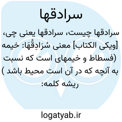 سرا پرده. خیمه. طبرسی گوید: آن خیمه ایست محیط به آنچه در آن است و گویند: سرادق چادریست که به اطراف خیمه می‏کشند در نهج البلاغه نامه 38 فرموده «فَضَرَبَ الْجَوُرُ سُرادِقَهُ عَلَی الْبِرِّ وَالْفاجِرِ»به نظر راغب: آن فارسی معرب است و در کلام عرب اسم مفردیکه حرف سوم آن الف باشد و بعد از آن دو حرف آید یافته نیست و گویند: خانه مُسردق خانه ایست که به شکل سرا پرده باشد. بنابراین می‏شود گفت که سرادق معرّب سراپرده است جمع آن سرادقات است. برای ستمکاران آتشی مهیّا کرده‏ایم که سراپرده‏اش آنها را در میان گرفته است. در بعضی آیات آمده. بنابراین تجس‏م عمل خطیئات مبدّل به اتش گشته و خطا کار را در میان گیرد. سرادق فقط یکبار در قرآن آمده است.