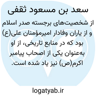 [ویکی شیعه] سعد بن مسعود ثَقَفی از صحابه پیامبر اکرم(ص) و از یاران امیرمؤمنان علی(ع) و عموی مختار بن ابوعبید ثقفی. وی در جنگ صفین، به ولایت مدائن گمارده شد و تا زمان امام مجتبی (ع) در این سمت بود. پس از ترور نافرجام امام حسن (ع) در ساباط مدائن، سعد مسئولیت حفاظت از جان امام (ع) را برعهده گرفت و تا بهبودی کامل امام (ع)، میزبان ایشان بود.