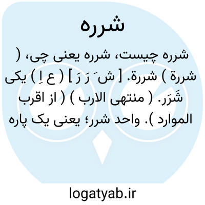 ( شررة ) شررة. [ ش َ رَ رَ ] ( ع اِ ) یکی شَرَر. ( منتهی الارب ) ( از اقرب الموارد ). واحد شرر؛ یعنی یک پاره آتش. ( ناظم الاطباء ). یکپاره آتش که بجهد. ( آنندراج ). جذوه آتش.