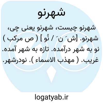 شهرنو. [ش َ ن َ / نُو ] ( ص مرکب ) نو به شهر درآمده. تازه به شهر آمده. غریب. ( مهذب الاسماء ). نودرشهر. شهرغریب.، شهر نو. [ ش َ رِ ن َ ] ( اِخ ) رجوع به شهرک نو شود.