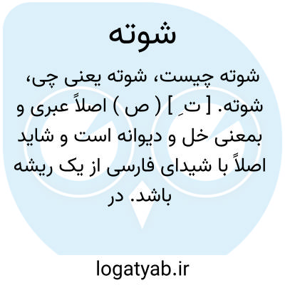شوته. [ ت ِ ] ( ص ) اصلاً عبری و بمعنی خل و دیوانه است و شاید اصلاً با شیدای فارسی از یک ریشه باشد. در زبان فارسی این لغت به همین معنی در بین بازاریان و همسایگان محله کلیمیان و کسانی که با این اقلیت دینی حشر و نشر دارند مستعمل است. در کرمانشاه «شیت » بر وزن چیت به همین معنی است و محتمل است که از همان ریشه گرفته شده باشد. ( از فرهنگ عامیانه جمال زاده ).