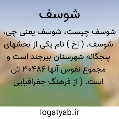 شوسف. ( اِخ ) نام یکی از بخشهای پنجگانه شهرستان بیرجند است و مجموع نفوس آنها 30486 تن است. ( از فرهنگ جغرافیایی ایران ج 9 ).