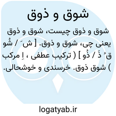 شوق و ذوق. [ ش َ / شُو ق ُ ذَ / ذُو ] ( ترکیب عطفی، اِ مرکب ) شوق ذوق. خرسندی و خوشحالی.