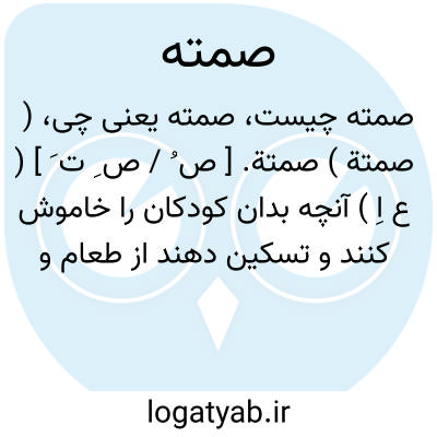 ( صمتة ) صمتة. [ ص ُ / ص ِ ت َ ] ( ع اِ ) آنچه بدان کودکان را خاموش کنند و تسکین دهند از طعام و شیرینی و مانند آن. ( منتهی الارب ). میوه که کودکان را بدان خاموش کنند. ( مهذب الاسماء ). سُکتَه. بهانه شکن. قاقالی لی.