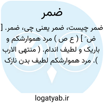 ضمر. [ ض َ ] ( ع ص ) مرد هموارشکم و باریک و لطیف اندام. ( منتهی الارب ). مرد هموارشکم لطیف بدن نازک اندام. ( منتخب اللغات ). باریک میان. ( دهار ). || اسب باریک ابرو( ؟ ). ( منتهی الارب ). اسبی که ابروانش باریک باشد ( ؟ ). ( منتخب اللغات ). || تنگ هرچه باشد. ( منتهی الارب ). ضیق. || نهانی. ( منتهی الارب ).