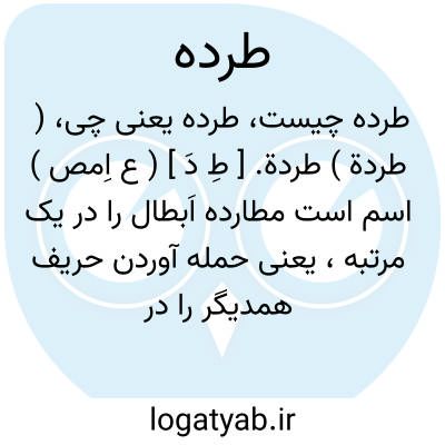 ( طردة ) طردة. [ طِ دَ ] ( ع اِمص ) اسم است مطارده اَبطال را در یک مرتبه، یعنی حمله آوردن حریف همدیگر را در یک بار. ( منتهی الارب ) ( آنندراج ).