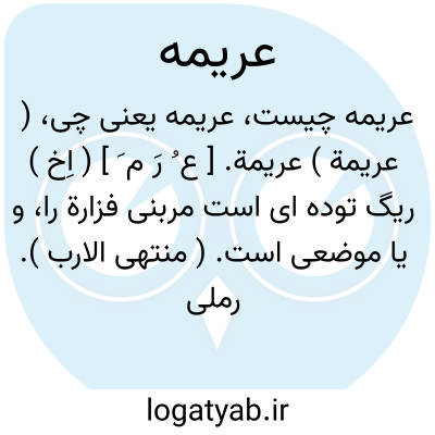 ( عریمة ) عریمة. [ ع ُ رَ م َ ] ( اِخ ) ریگ توده ای است مربنی فزارة را، و یا موضعی است. ( منتهی الارب ). رملی است و آن را آبی است بنام عَبسیّة و گویند آن رمله ای است ازآن ِ بنی سعد و برخی آن را برای بنی فزاره دانسته اند. و نیز گویند آن شهری است. ( از معجم البلدان ).