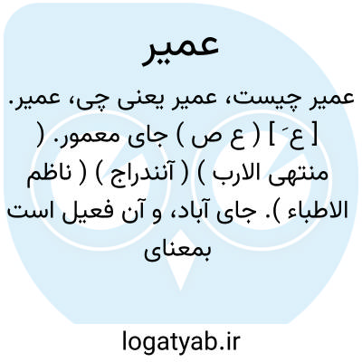 عمیر. [ ع َ ] ( ع ص ) جای معمور. ( منتهی الارب ) ( آنندراج ) ( ناظم الاطباء ). جای آباد، و آن فعیل است بمعنای مفعول. ( از اقرب الموارد ). || ثوب عمیر؛ جامه سخت باف. ( منتهی الارب ) ( آنندراج ) ( ناظم الاطباء ). جامه محکم. ( از اقرب الموارد ). || کثیربجیر عمیر؛ از اتباع است. ( منتهی الارب ) ( از اقرب الموارد ) ( آنندراج ). بسیار متعدد. ( ناظم الاطباء ). کثیربشیر، بجیر عمیر؛ از اتباع است. ( از تاج العروس ).