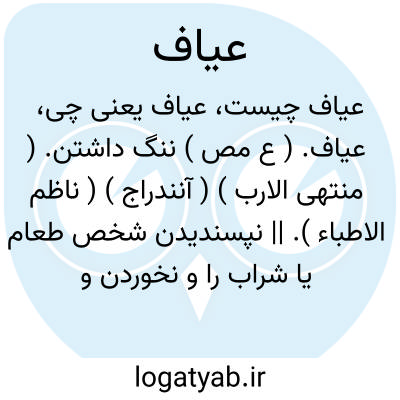 عیاف. ( ع مص ) ننگ داشتن. ( منتهی الارب ) ( آنندراج ) ( ناظم الاطباء ). || نپسندیدن شخص طعام یا شراب را و نخوردن و ننوشیدن آن. ( از اقرب الموارد ) ( از ناظم الاطباء ) ( از آنندراج ). || ترک گفتن شخص آب را، در حالیکه تشنه باشد. ( از اقرب الموارد ). عَیف. عَیَفان. رجوع به عیف و عیفان شود.