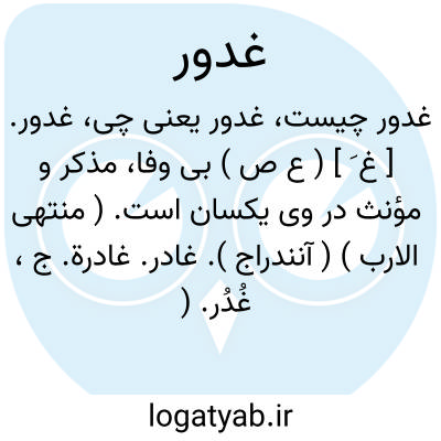 غدور. [ غ َ ] ( ع ص ) بی وفا، مذکر و مؤنث در وی یکسان است. ( منتهی الارب ) ( آنندراج ). غادر. غادرة. ج، غُدُر. ( اقرب الموارد ). || شتر ماده که از گله پس ماند، و اگر چوپان خود شتر را ترک کند آن را غدیرة گویند. ( از تاج العروس ).
