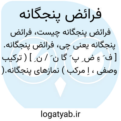 فرائض پنجگانه. [ ف َ ءِ ض ِ پ َ گا ن َ / ن ِ ] ( ترکیب وصفی، اِ مرکب ) نمازهای پنجگانه.( آنندراج ). || ارکان ایمان که پنج است: صوم، صلوة، حج، زکوة و یک بار خواندن کلمه شهادت، یانزد بعضی علماء خمس که به سادات دهند. ( آنندراج ).