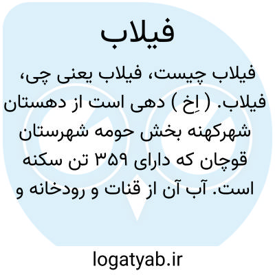 فیلاب. ( اِخ ) دهی است از دهستان شهرکهنه بخش حومه شهرستان قوچان که دارای 359 تن سکنه است. آب آن از قنات و رودخانه و محصول عمده اش غله، انگور و کاردستی مردم قالیچه بافی است. ( از فرهنگ جغرافیایی ایران ج 9 ).