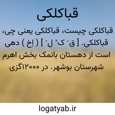 قباکلکی. [ ق َ ک ُ ل َ ] ( اِخ ) دهی است از دهستان بانمک بخش اهرم شهرستان بوشهر. در 12000گزی باختری اهرم و خاور کوه قلانک واقع و موقع جغرافیایی آن جلگه و گرمسیر مالاریائی است. 795 تن سکنه دارد. آب آن از چاه و محصول آن غلات و خرما و شغل اهالی زراعت است. راه فرعی دارد. ( از فرهنگ جغرافیایی ایران ج 7 ).