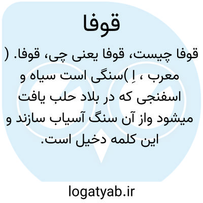 قوفا. ( معرب، اِ )سنگی است سیاه و اسفنجی که در بلاد حلب یافت میشود واز آن سنگ آسیاب سازند و این کلمه دخیل است. ( از اقرب الموارد ). نوعی از صمغ صنوبر باشد و آن را به عربی علک یابس خوانند و به فارسی زنگباری گویند. ( آنندراج ) ( فهرست مخزن الادویه ) ( برهان ). نوعی از صنوبر است. ( فهرست مخزن الادویه ).