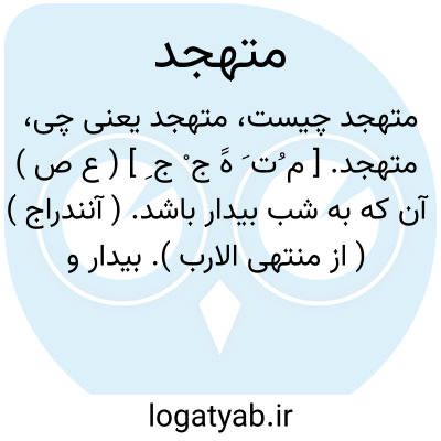 متهجد. [ م ُت َ هََ ج ْ ج ِ ] ( ع ص ) آن که به شب بیدار باشد. ( آنندراج ) ( از منتهی الارب ). بیدار و بی خواب و بیدار در شب و از خواب برخیزنده در شب. ( ناظم الاطباء ). کسی که در شب جهت عبادت پروردگار برخیزد. شب زنده دار. ( یادداشت به خط مرحوم دهخدا ). || خفته در شب. ( از منتهی الارب ) ( ناظم الاطباء ). و رجوع به تهجد شود.
