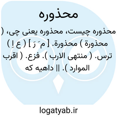 ( محذورة ) محذورة. [ م َ رَ ] ( ع اِ ) ترس. ( منتهی الارب ). فزع. ( اقرب الموارد ). || داهیه که از آن بپرهیزند. ( اقرب الموارد ). بلا که از آن پرهیز کنند. ( منتهی الارب ). || جنگ. ( منتهی الارب ). و فی الاساس صحبتهم المحذورة، و هی الخیل المغیرة او الصیحة. ( از اقرب الموارد ).