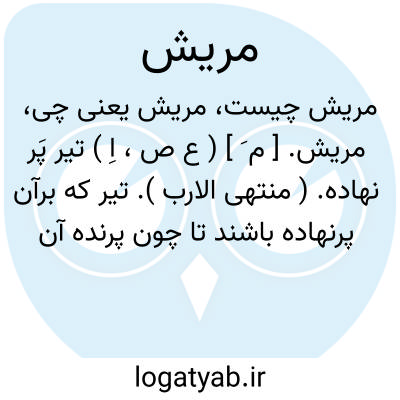 مریش. [ م ُ رَی ْ ی َ ] ( ع ص،اِ ) نعت مفعولی از مصدر ترییش. رجوع به ترییش شود. || تیر پَر نهاده. ( منتهی الارب ). تیر که بر آن پر نهند تا چون پرنده آن را به هوا برد. ( از اقرب الموارد ). و رجوع به مَریش شود. || شتر بسیارپشم و کم گوشت. ( منتهی الارب ) ( از اقرب الموارد ). || چادر منقش. ( منتهی الارب ). برد موشّی بصورت پر. ( از اقرب الموارد ). || مرد سست پشت و صلب. ( منتهی الارب ) ( از اقرب الموارد ). || هوده و هودج اصلاح یافته از دوال و مانند آن. ( از منتهی الارب ) ( از اقرب الموارد ). || شخصی که سلطان او را «ریشه » و پَر بدهد تا به علامت شرف و افتخار آن را بر سر نهد. ( از اقرب الموارد ).
