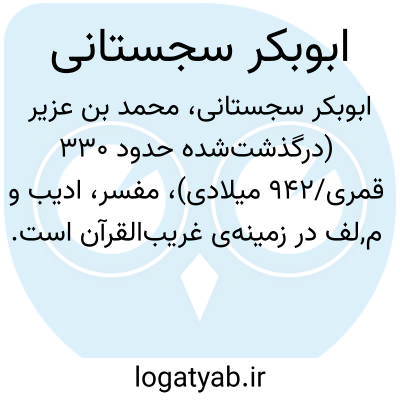 [ویکی فقه] ابوبَکْرِ سِجِسْتانی، محمد بن عزیر (د ح۳۳۰ق/۹۴۲م)، مفسر، ادیب و مؤلف در زمینۀ غریب القرآن است.