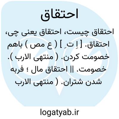 احتقاق. [ اِ ت ِ ] ( ع مص ) باهم خصومت کردن. ( منتهی الارب ). خصومت. || احتقاق مال؛ فربه شدن شتران. ( منتهی الارب ). || احتقاق طعنه به؛ کشتن طعنه او را یا رسیدن طعنه در سر سرین وی که در استخوان ران است. به اندرون چیزی فروبردن نیزه. || لاغر شدن ستور. || احتقاق فرس؛ باریک میان شدن اسب. ( منتهی الارب ).