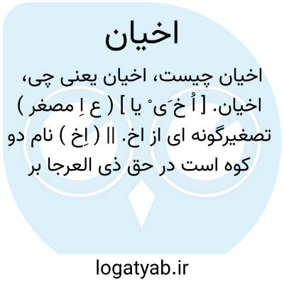 اخیان. [ اُ خ َی ْ یا ] ( ع اِ مصغر ) تصغیرگونه ای از اخ. || ( اِخ ) نام دو کوه است در حق ذی العرجا بر شبیکه و آن آبی است در بطن وادئی و در آنجا چاههای بسیار است. ( معجم البلدان ).