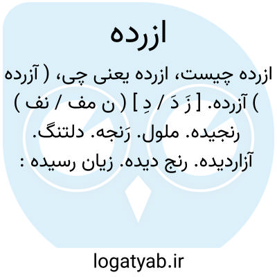 ( آزرده ) آزرده. [ زَ دَ / دِ ] ( ن مف / نف ) رنجیده. ملول. رَنجه. دلتنگ. آزاردیده. رنج دیده. زیان رسیده:
