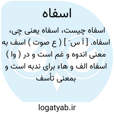 اسفاه. [ اَ س َ ] ( ع صوت ) اسف به معنی اندوه و غم است و در ( وا ) اسفاه الف و هاء برای ندبه است و بمعنی تأسف و افسوس مستعمل است. ( غیاث اللغات ). رجوع به اَسَفا و اَسَفی ̍ شود.