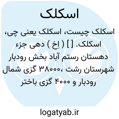 اسکلک. [ ] ( اِخ ) دهی جزء دهستان رستم آباد بخش رودبار شهرستان رشت،38000 گزی شمال رودبار و 4000 گزی باختر راه شوسه رودبار - رشت. سکنه 428 تن، شیعه. زبان گیلکی، فارسی. رودخانه محلی و چشمه سار، محصول برنج، زغال، لبنیات. شغل اهالی زراعت، گله داری، زغال سوزی، شال و جوراب بافی. 20 باب دکاکین مختلف و زغال فروشی و قهوه خانه سر راه شوسه دارد. ( فرهنگ جغرافیائی ایران ج 2 ص 13 ).