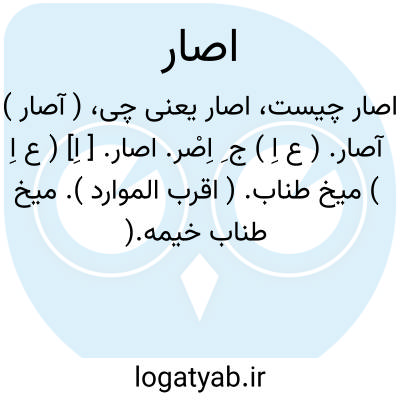 اصار. [ اِ] ( ع اِ ) میخ طناب. ( اقرب الموارد ). میخ طناب خیمه.( منتهی الارب ) ( آنندراج ). اصارة. ایصر. || حشیش. ( اقرب الموارد ). گیاه. ( منتهی الارب ). اصارة. ایصر. || رسن کوتاه که بدان دامن خیمه به میخ بربندند. ( منتهی الارب ) ( آنندراج ). رسن که دامن خیمه با میخ بدان بندند. ج، اُصُر. ( مهذب الاسماء ). || زنبیل. || گلیمی که در آن گیاه پر کرده آرند. ( منتهی الارب ) ( آنندراج ) ( اقرب الموارد ). ج، اُصُر، آصرة. ( منتهی الارب ) ( اقرب الموارد ).