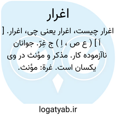 اغرار. [ اَ ] ( ع ص، اِ ) ج غِرّ. جوانان ناآزموده کار. مذکر و مؤنث در وی یکسان است. غرة: مؤنث. ( آنندراج ) ( منتهی الارب ). ج ِ غِرّ، بمعنی جوان بی تجربة و الشابة کذلک یقال: «شاب غر و شابة غر و غرة». ( از اقرب الموارد ). و رجوع به مفردات کلمه شود.