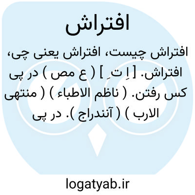 افتراش. [ اِ ت ِ ] ( ع مص ) در پی کس رفتن. ( ناظم الاطباء ) ( منتهی الارب ) ( آنندراج ). در پی اثر رفتن. ( ناظم الاطباء ). بر اثر پی کس رفتن. ( از اقرب الموارد ). || گفتن چنانکه خواهند. ( منتهی الارب ). سخن گفتن بدلخواه. ( از اقرب الموارد ). زبان بسخن گوی دراز کردن. ( آنندراج ): افترش لسانه؛ گفت بطوری که خواست. ( ناظم الاطباء ). || وطی کردن. ( منتهی الارب ) ( ناظم الاطباء ). || جماع کردن. ( آنندراج ). مجامعت کردن. ( المصادر زوزنی ). زناشوئی کردن با زنی. ( از اقرب الموارد ). || سپردن زیر پای. ( منتهی الارب ) ( ناظم الاطباء ) ( آنندراج ). زیر پای گذاردن چیزی را. ( از اقرب الموارد ). || هردو بازو بر زمین گستردن. ( منتهی الارب ) ( ناظم الاطباء ). دو بازو بر زمین گستردن. بازوان همچون فرش بر زمین پهن کردن. ( از اقرب الموارد ). دو ارش دست بزمین نهادن. ( المصادر زوزنی ). دو دست بر زمین نهادن. ( آنندراج ). || چیره شدن. ( منتهی الارب ) ( آنندراج )( ناظم الاطباء ). غلبه کردن بر کس و بر زمین زدن او را. ( از اقرب الموارد ). || بر زمین افکندن کسی را. ( منتهی الارب ) ( آنندراج ) ( ناظم الاطباء ). || روا داشتن ننگ و عیب را در ناموس کسی. ( منتهی الارب ). عیب و ننگ را در ناموس کسی روا داشتن. ( ناظم الاطباء ). بدگوئی و ننگ در ناموس کسی روا داشتن. ( از اقرب الموارد ). || گسترده شدن. ( ناظم الاطباء ) ( منتهی الارب ) ( تاج المصادر بیهقی ) ( المصادر زوزنی ). پهن شدن چیزی. ( از اقرب الموارد ). || بستم گرفتن چیزی را. ( ناظم الاطباء ) ( منتهی الارب ).بستم گرفتن مال کسی را. ( آنندراج ). غصب کردن. ( منتهی الارب ) ( آنندراج ) ( ناظم الاطباء ). غصب کردن مال کسی را. ( از اقرب الموارد ). || گستردن. ( از تاج المصادر بیهقی ). پهن کردن. باز کردن. ( یادداشت بخطمؤلف ). || طی کردن راه. ( از اقرب الموارد ). || فرش ساختن. ( یادداشت بخط مؤلف ).