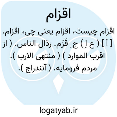 اقزام. [ اَ ] ( ع اِ ) ج ِ قَزَم. رذال الناس. ( از اقرب الموارد ) ( منتهی الارب ). مردم فرومایه. ( آنندراج ). رجوع به قزم شود.