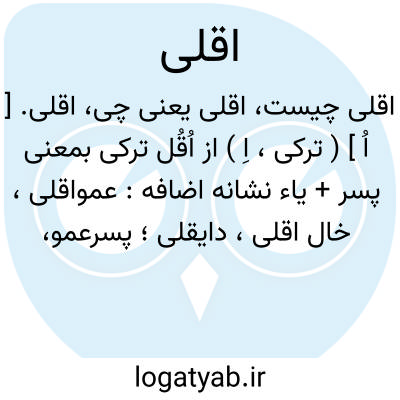 اقلی. [ اُ ] ( ترکی، اِ ) از اُقُل ترکی بمعنی پسر + یاء نشانه اضافه: عمواقلی، خال اقلی، دایقلی؛ پسرعمو، پسرخاله، پسردایی. ( یادداشت مؤلف ).