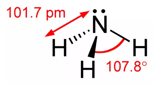 مولکول آمونیاک از یک اتم نیتروژن و سه اتم هیدروژن متصل به آن تشکیل شده است. با توجه به وجود یک جفت الکترون ناپیوندی بر روی نیتروژن، این مولکول ساختار هرم مثلثی دارد و زوایای پیوند کم تر از ۱۰۹ درجه هستند. مولکول آمونیاک یک مولکول قطبی است که می تواند با خودش و بسیاری مولکول های دیگر، پیوند هیدروژنی برقرار نماید.