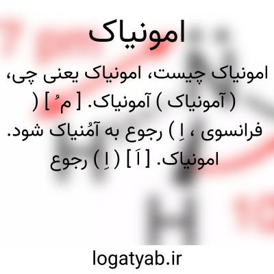 ( آمونیاک ) ( اسم ) گازیست بی رنگ بابوی تند و طعم حاد و اشک آور است و در آب حل میشود آن یکی از ترکیبات ازت است که در هوای شهرها و مجاورت مستراحها وجود دارد و از تجرب. اور. ادرار بوسیل. میکرب مخصوص و نیز از تکلیس نشادر با آهک بدست میاید و در صنعت و طب مستعمل است.