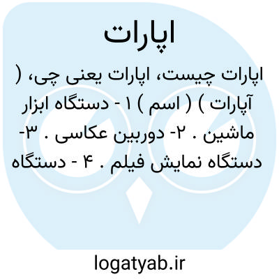 ( آپارات ) ( اسم ) ۱ - دستگاه ابزار ماشین. ۲- دوربین عکاسی. ۳- دستگاه نمایش فیلم. ۴ - دستگاه تعمیر و اصلاح لاستیک اتومبیل.
