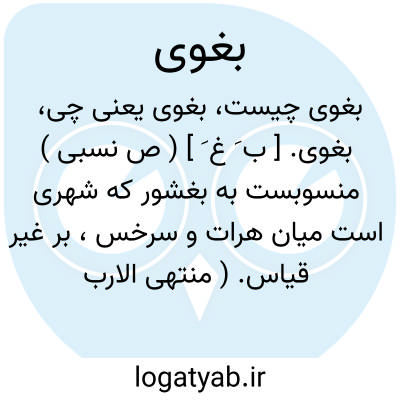 بغوی. [ ب َ غ َ ] ( ص نسبی ) منسوبست به بغشور که شهری است میان هرات و سرخس، بر غیر قیاس. ( منتهی الارب ذیل بغشور ) ( از آنندراج ). نسبت به بغشور. ( از رشیدی ). منسوب بقریه بغشور. ( ناظم الاطباء ). شخص منسوب به بغشور که آبادیی است در خراسان. لفظ مذکور مخفف بغشوری است. ( از فرهنگ نظام ). منسوبست به بغ نام شهری بخراسان میان مرو و هرات و آنرا بغشور نیز گویند. ( ابن خلکان در ترجمه فراء حسین بن معود بغوی ). منسوبست به بغو که از بلاد خراسان است بین مرو و هرات. ( سمعانی ).