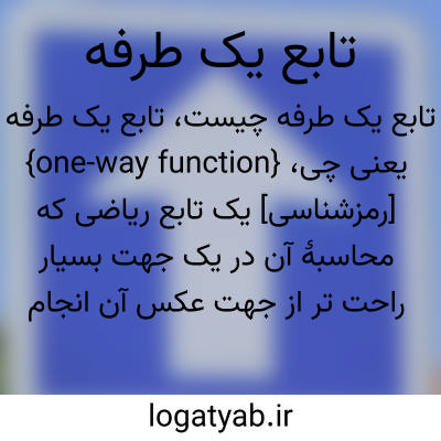 {one-way function} [رمزشناسی] یک تابع ریاضی که محاسبۀ آن در یک جهت بسیار راحت تر از جهت عکس آن انجام پذیر باشد