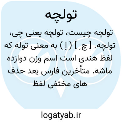 تولچه. [ چ ِ ] ( اِ ) به معنی توله که لفظ هندی است اسم وزن دوازده ماشه. متأخرین فارس بعد حذف های مختفی لفظ «چه » زائد کرده نوعی از تفریس کرده. ( غیاث اللغات ). یعنی نود و شش حبه. ( آنندراج ). نام وزنه ای. ( ناظم الاطباء ). و آن دوازده ماشه و معادل دو مثقال و نیم است. ( یادداشت بخط مرحوم دهخدا ).