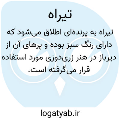 تیراه به پرندهای اطلاق میشود که دارای رنگ سبز بوده و پرهای آن از دیرباز در هنر زریدوزی مورد استفاده قرار میگرفته است. این پرنده به دلیل زیبایی رنگی و ویژگیهای خاص پرهایش، در صنایع دستی و تزئینی اهمیت ویژهای داشته است. مطابق با لغتنامه دهخدا و منابع معتبر دیگر مانند «ناظم الاطبا»، این پرنده همچنین با عنوان سبزک نیز شناخته میشود؛ نامی که به وضوح به رنگ غالب و برجسته آن اشاره دارد. استفاده از پرهای این گونه در بافندگی و دوختوسوزهای ظریف، نشاندهنده جایگاه آن به عنوان یک منبع طبیعی ارزشمند در هنرهای سنتی ایرانی است.