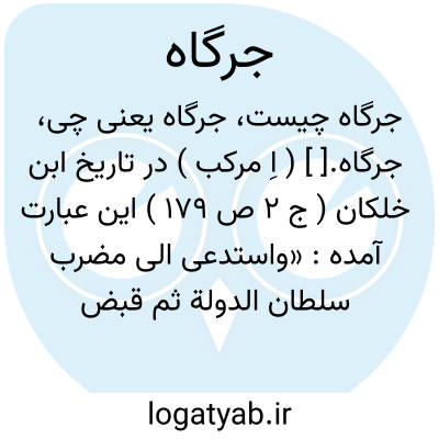 جرگاه.[ ] ( اِ مرکب ) در تاریخ ابن خلکان ( ج 2 ص 179 ) این عبارت آمده: «واستدعی الی مضرب سلطان الدولة ثم قبض علیه ( علی فخرالملک ) و عدل به الی جرگه و قد احیط علی امواله و خزائنه و کرائمه و ولده و اصحابه ». این لغت در جائی دیده نشده است و گمان میکنم از جر عربی و گاه فارسی مرکب شده باشد، نام جایی که عاملین را برای اخذ بقایا، جر و شکنجه میکردند. ( یادداشت مؤلف ).