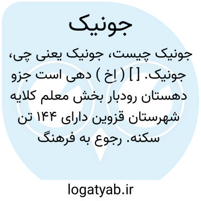جونیک. [ ] ( اِخ ) دهی است جزو دهستان رودبار بخش معلم کلایه شهرستان قزوین دارای 144 تن سکنه. رجوع به فرهنگ جغرافیایی ایران ج 1 شود.