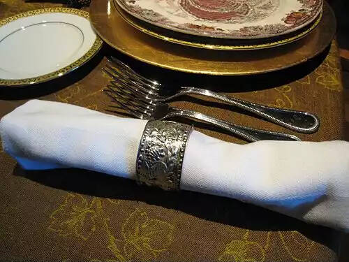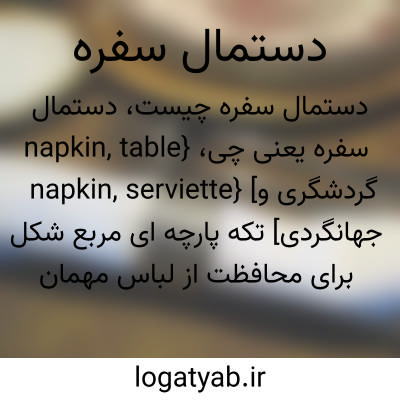 {napkin, table napkin, serviette} [گردشگری و جهانگردی] تکه پارچه ای مربع شکل برای محافظت از لباس مهمان و پاک کردن دهان در هنگام غذا خوردن
