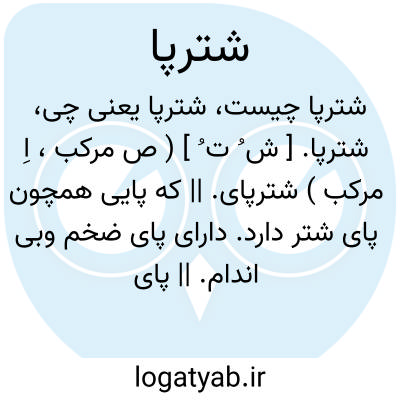 شترپا. [ ش ُ ت ُ ] ( ص مرکب، اِ مرکب ) شترپای. || که پایی همچون پای شتر دارد. دارای پای ضخم وبی اندام. || پای اشتر. سپل. شپیل. رجل الجمل. نام گیاهی که برگ آن به کف پای شتر ماند. ( ناظم الاطباء ). || کاکوتی. سعتر. رجوع به اشترپاشود. || گل آفتاب گردان. ( ناظم الاطباء ).