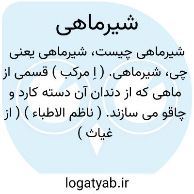 شیرماهی. ( اِ مرکب ) قسمی از ماهی که از دندان آن دسته کارد و چاقو می سازند. ( ناظم الاطباء ) ( از غیاث ) ( از آنندراج ). سنگ صدفی نفیس و آن دندان شیرماهی است که در سابق از آن دسته خنجر و امثال آن می کردند و گاهی مرصع به جواهر بود به قطر ساعد کودکی پنج شش ساله. رنگ آن به رنگ ابری میان تیره و روشن و شفاف گونه بود یعنی اگر به تنکی کاغذ می بریدند حاجب ماوراء نبود و مانند شیشه که کمی دودزده باشد چیزها از پشت آن دیده می شد. ( یادداشت مؤلف ): و کانوا [ اهل ظفار ] یصطادون سمکاً یسمی بالفارسیة شیرماهی و معناه اسدالسمک وهو یشبه الحوت المسمی عندنا بتازرت. ( ابن بطوطه ).
