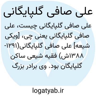 [ویکی شیعه] علی صافی گلپایگانی(۱۲۹۱- ۱۳۸۸ش) فقیه شیعی ساکن گلپایگان بود. وی برادر بزرگ ترِ آیت الله لطف الله صافی گلپایگانی است.