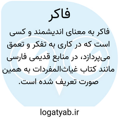 فاکِر به معنای اندیشمند و کسی است که در کاری به تفکر و تعمق میپردازد، در منابع قدیمی فارسی مانند کتاب غیاثالمفردات به همین صورت تعریف شده است. این واژه بهطور خاص به فردی اشاره دارد که پیش از اقدام یا تصمیمگیری، به بررسی و تحلیل دقیق موضوع میپردازد و جنبههای مختلف آن را میسنجد.