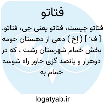 فتاتو. [ ف َ ] ( اِخ ) دهی از دهستان حومه بخش خمام شهرستان رشت، که در دوهزار و پانصد گزی خاور راه شوسه خمام به بندرانزلی واقع است. جلگه ای معتدل، مرطوب و دارای 410 تن سکنه است. آب آنجا را نهر کته سر سفیدرود تأمین میکند. محصول عمده این ده برنج، غلات، توتون، سیگار، صیفی و شغل اهالی زراعت و حصیربافی است. راه مالرو دارد. ( از فرهنگ جغرافیایی ایران ج 3 ).